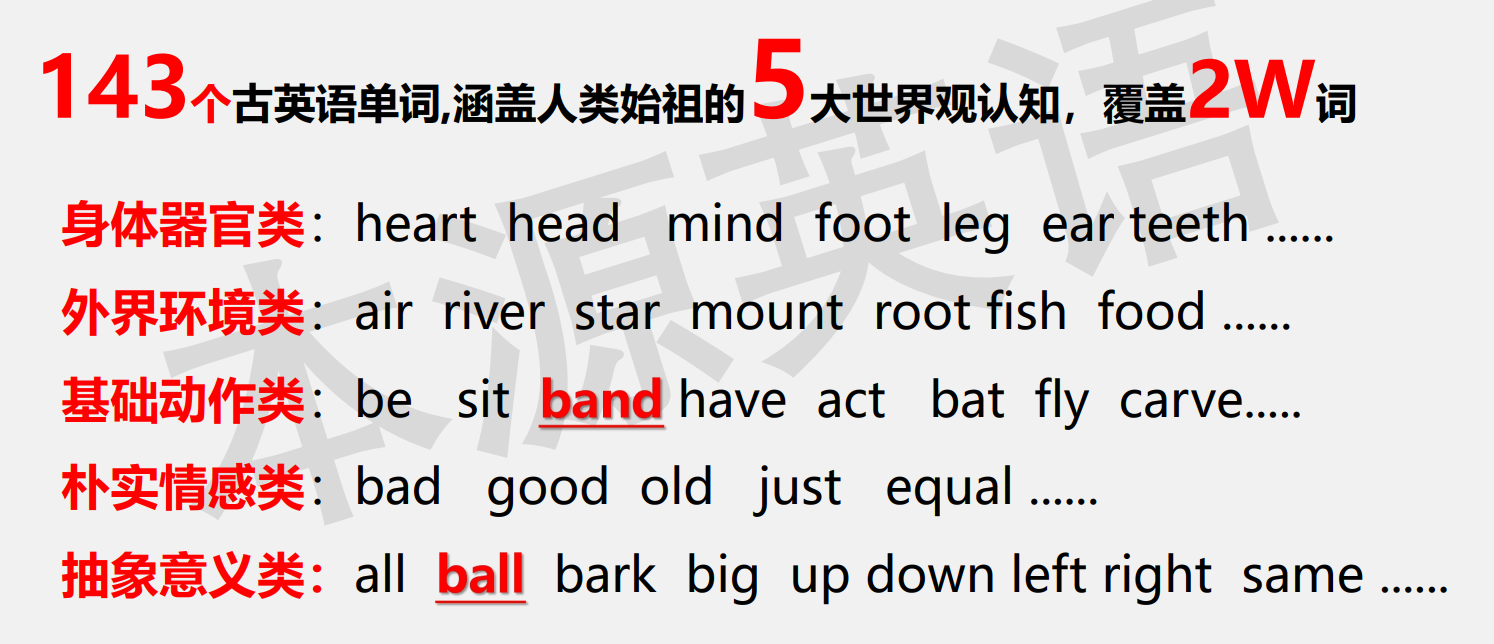 古英语单词可以音变成词根,也可以音变成其他单词。该课程的 143 个古英语单词,涵盖人类始祖的 5 大世界观认知,覆盖 2W 词。