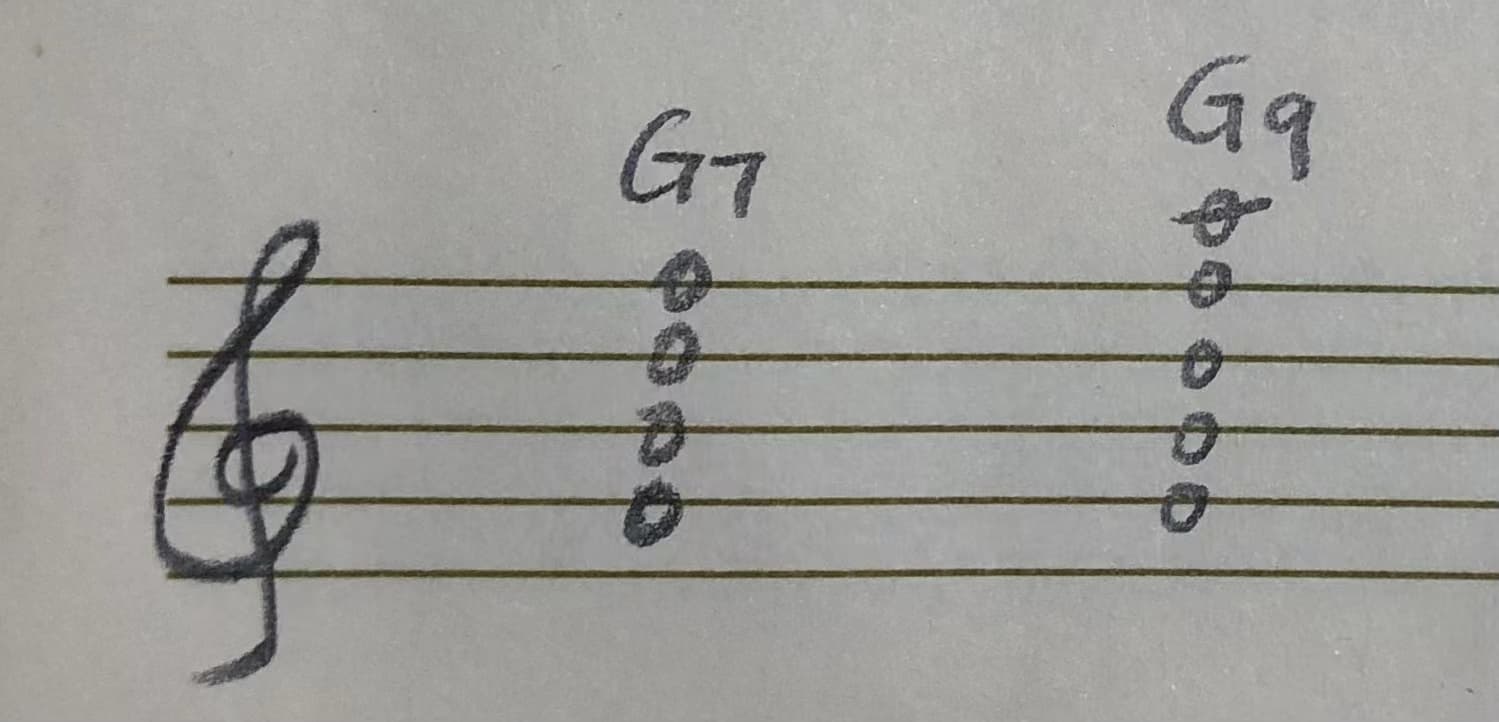 左手弹 G9 时,右手刚好弹 6,也就是左手其实还是在弹 G7。