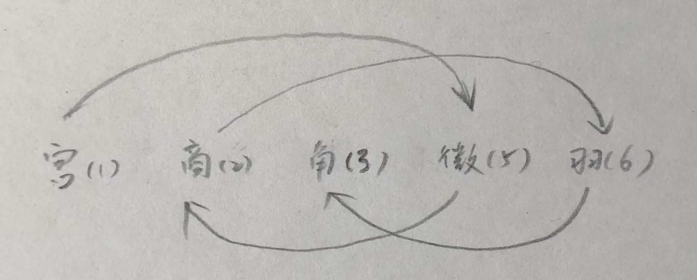 - 宫(1)、徵(5)、商(2)、羽(6)、角(3)