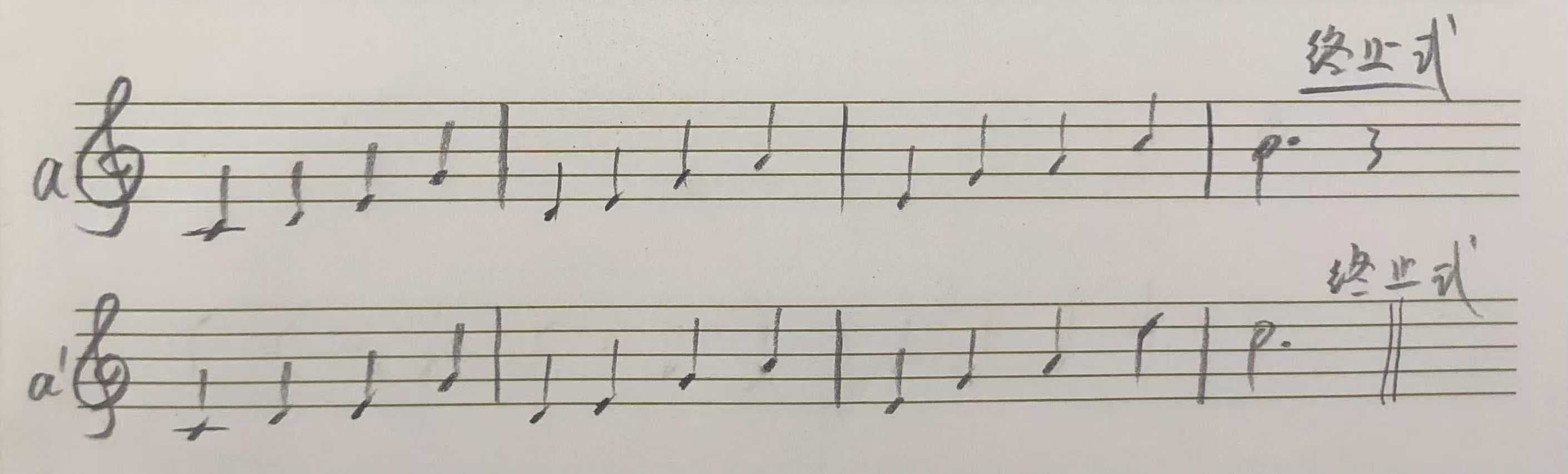 这是一个并行乐句的乐段。a 是前乐句,a' 是后乐句,通常是 4 小节一句。