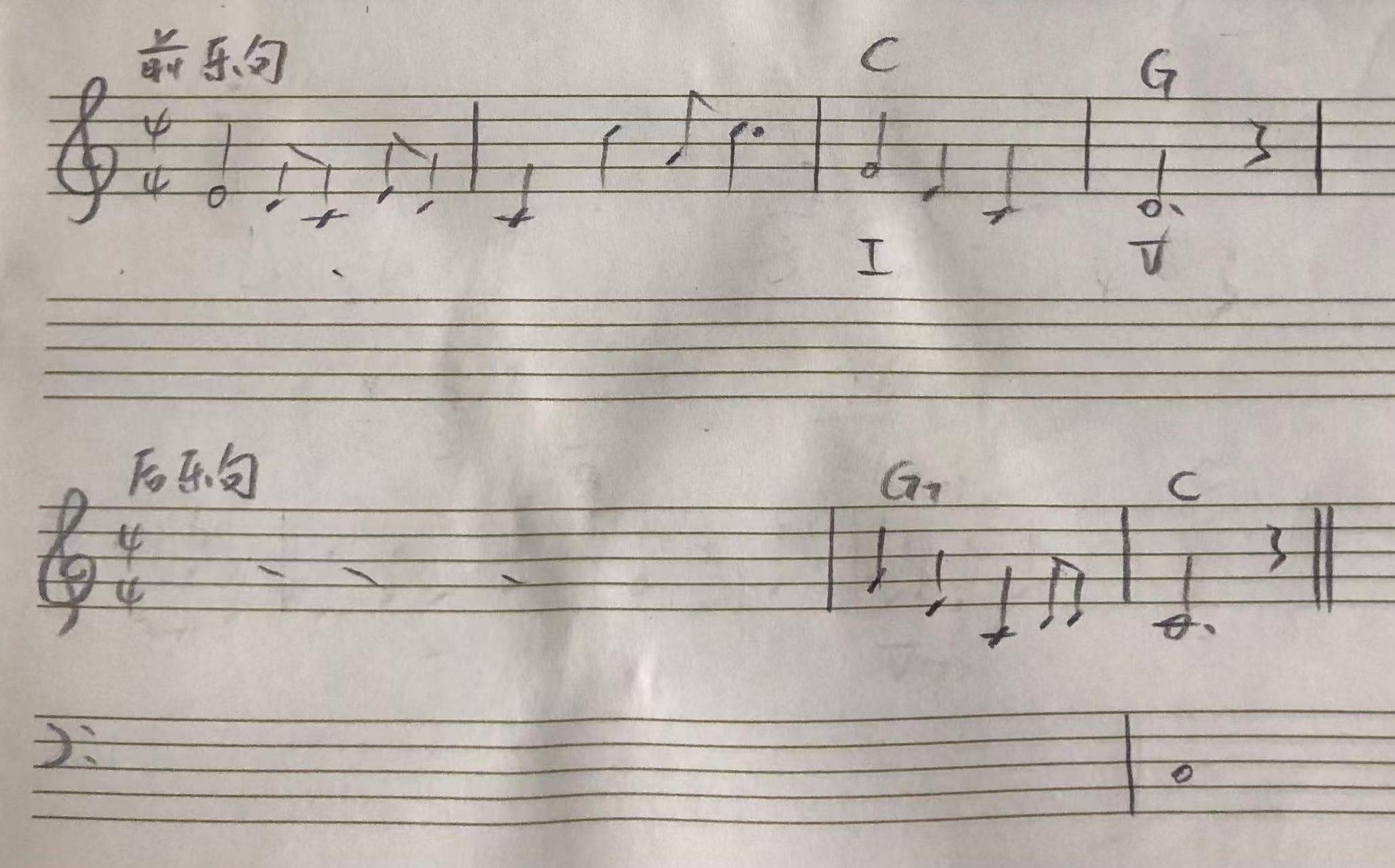 - a 乐句:属于前乐句,G 大调的歌,首调唱法结尾唱 3(mi),即使用不完全终止。